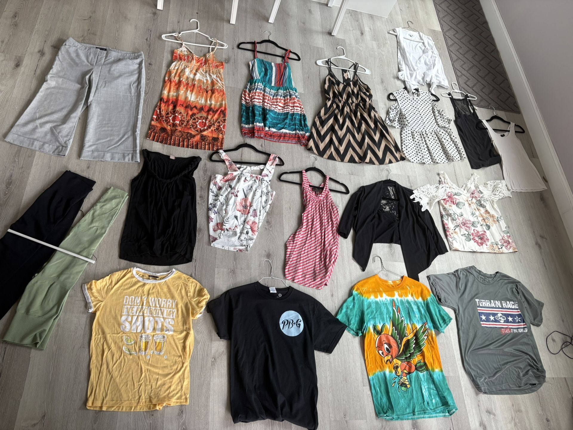 Assorted dresses tops and pants 3-dresses 4-T-shirts 2-spank type pants 1-capri work pants (size 10) Few extra tops about 8 Small black sweater top