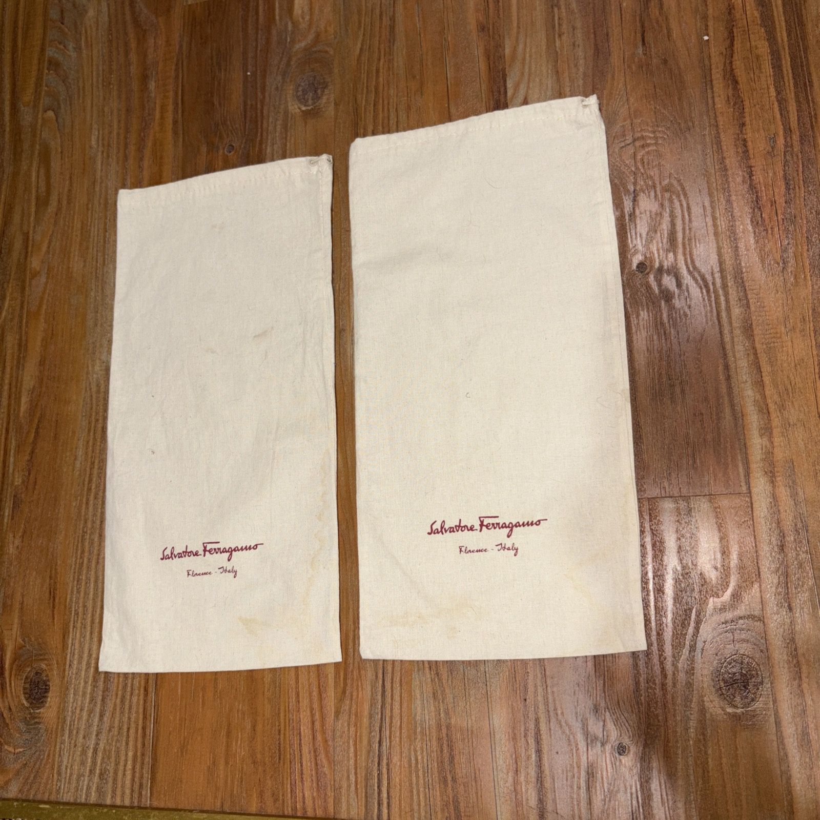 The Salvatore Ferragamo Dust Shoe Bag in white is a luxurious and practical accessory for protecting your shoes while traveling. Made in Italy, this bag measures 8 x 16.5 inches, providing ample space for storing and transporting a pair of designer shoes. The iconic Salvatore Ferragamo brand ensures both quality and style, making this shoe bag a must-have for any fashion-forward traveler. These bags have never been used. Have been in storage in and out of boxes and have some discoloration. With some stain spray and soaking I’m sure they will come clean.