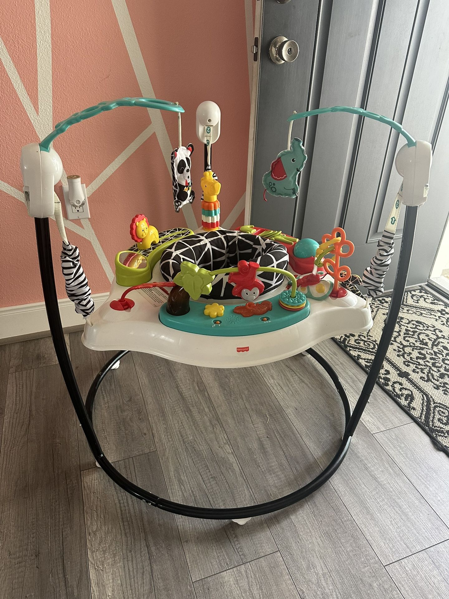 Music,lights and sounds Seat spins 360 Adjustable to 3 heights Removable, machine-washable seat pad