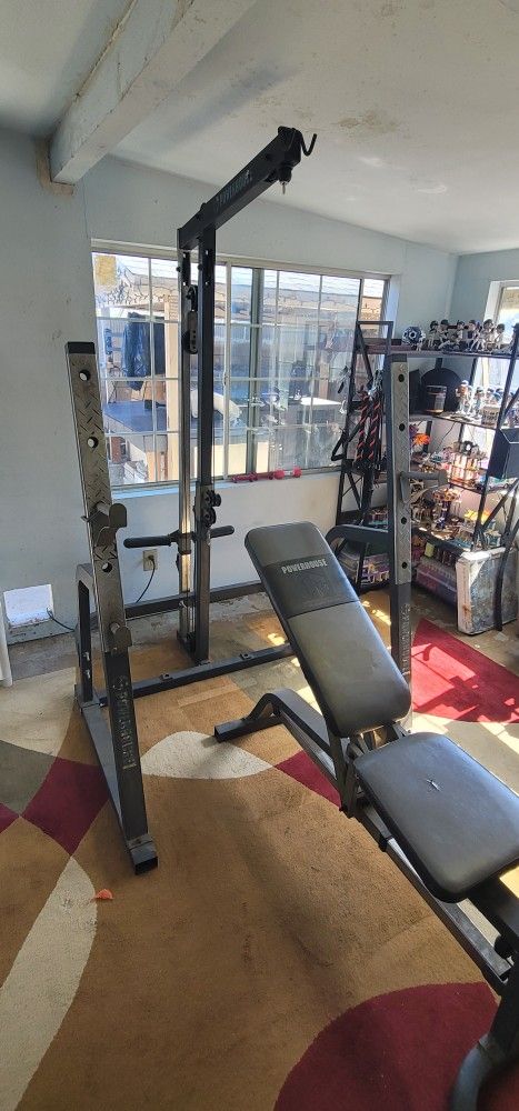 Impex powerhouse workout machine in used but good working condition. Has pulley system on top for lat pulldown and pulley system on bottom for seated row. Bench is included, can adjust to Incline, decline, flat. Bench has minor tear, as shown in picture. Olympic barbell is included along with a pair of 45 lb plates, a pair of 25lb plates, and four 5 lb plates. A few workout attachments are also included. Already partially disassembled for easy pickup. You pick up in Chino. $225.