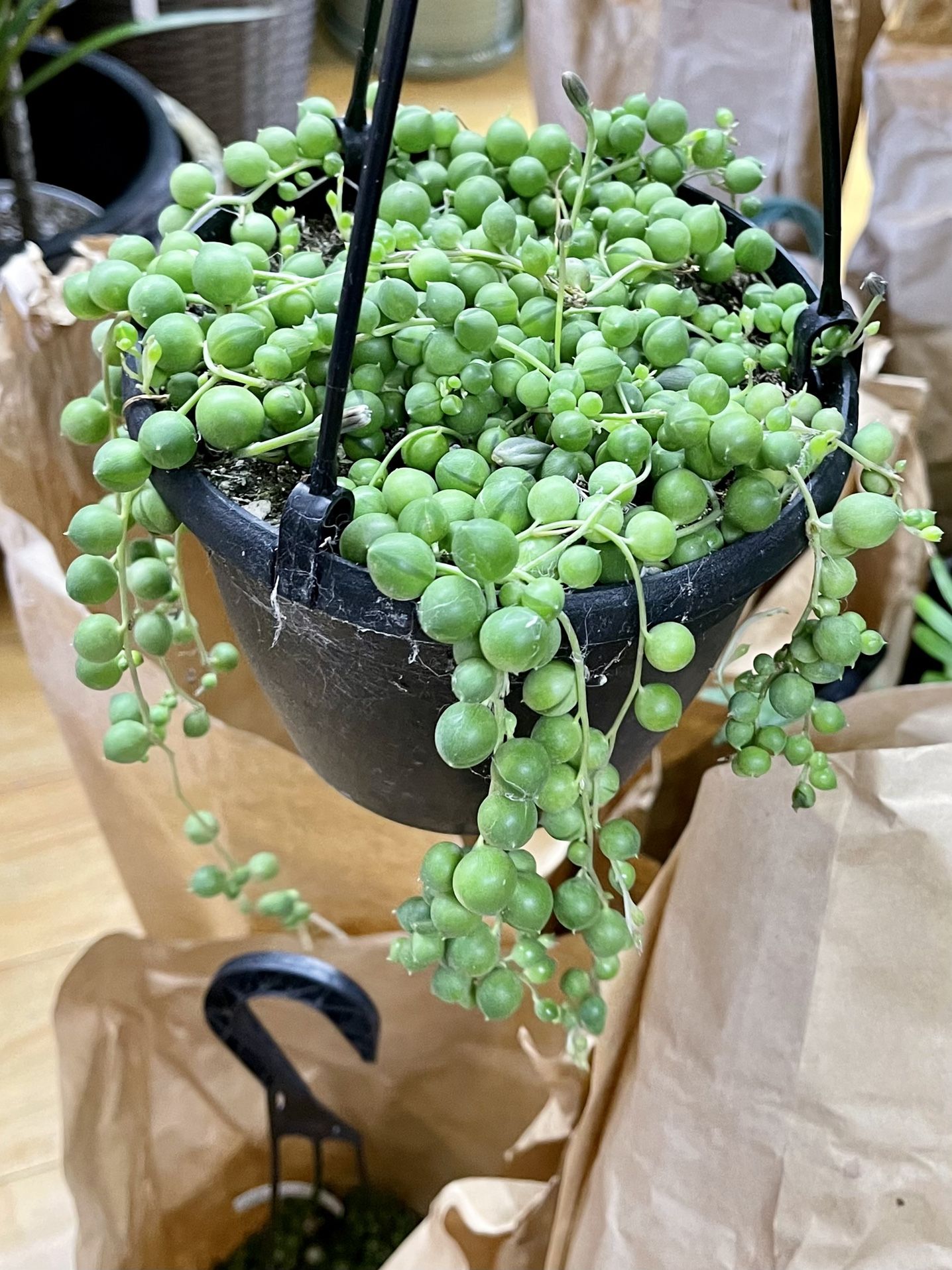 Curio rowleyanus, syn. Senecio rowleyanus, is a flowering plant in the daisy family Asteraceae. It is a creeping, perennial, succulent vine . 6” pot $18