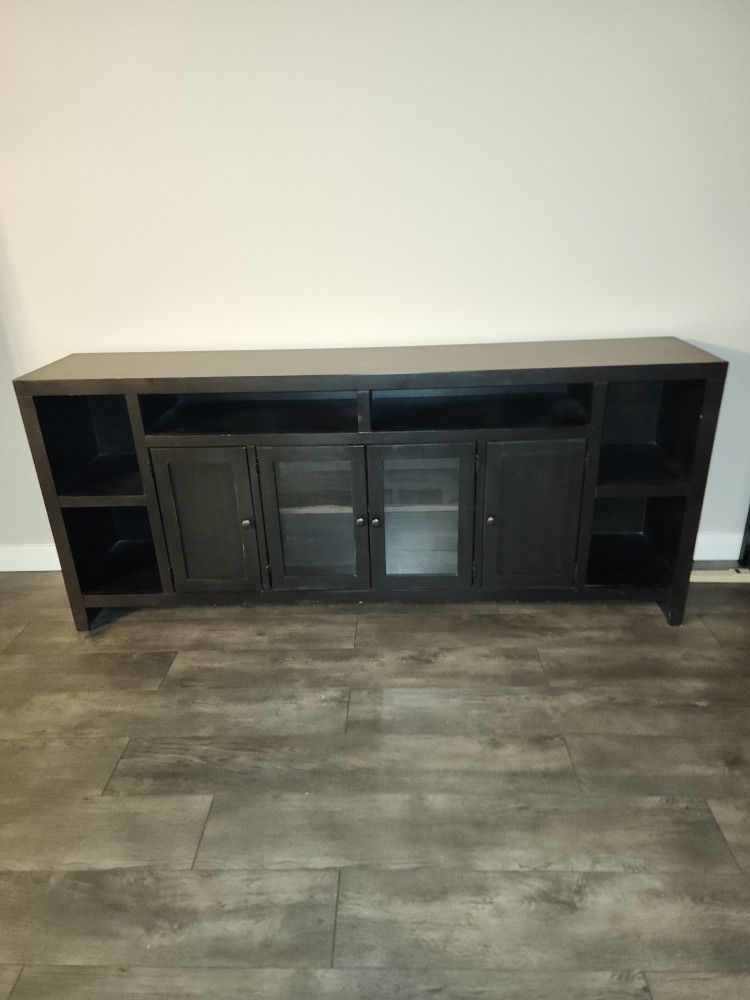 Spacious TV stand with multiple shelves and cabinets. 84" wide X 36" tall X 16.5" deep.