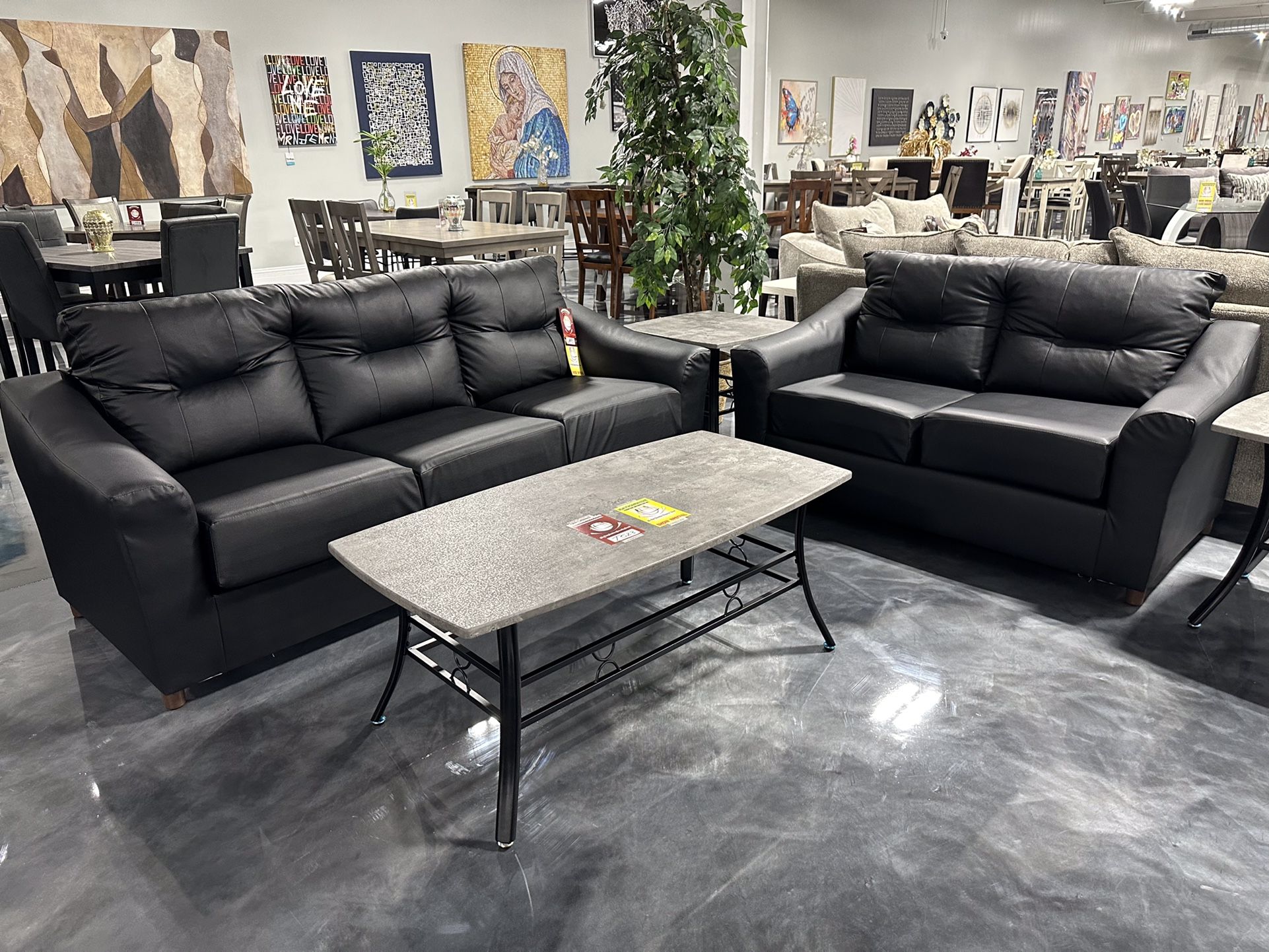 Brand new sofa and loveseat in black vinyl leather also available in gray Delivery options available
