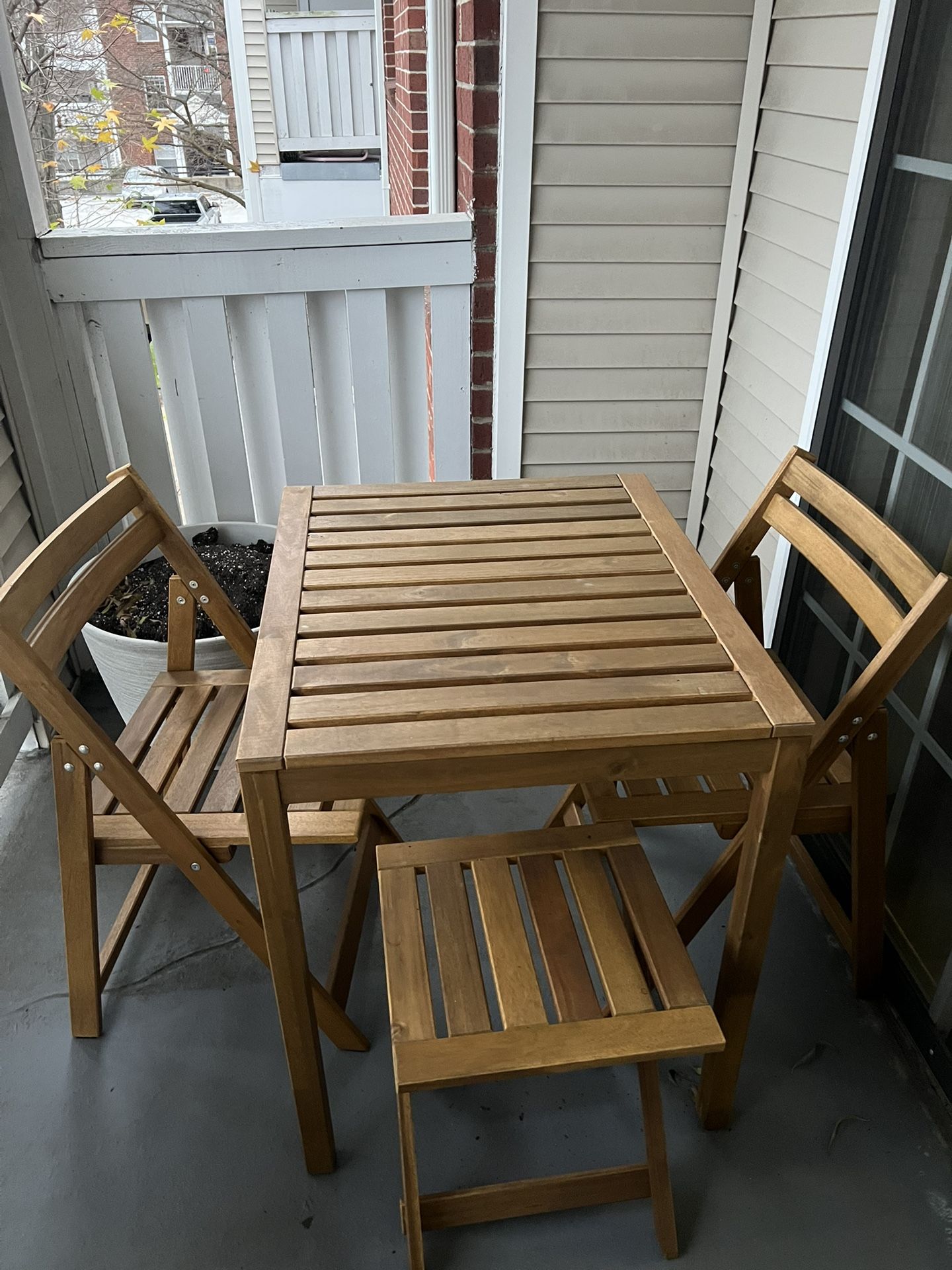 Table, 2 folding chairs, chair cushions, and stool. Outdoor furniture less than 2 years old from IKEA. The Nammaro Outdoor set is in great condition, total purchase value over $250. Must be purchased as a set or the stool only. Must be willing to pickup.
