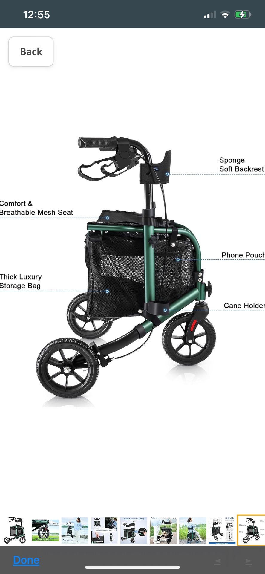 3 Wheel Rollator Walker with Seat for Slim Seniors, Padded Backrest Lightweight Foldable Walker Ideal for Elderly, 8 Inch Tri-Wheel Modern Mobility Walking Aid Aluminum, Green