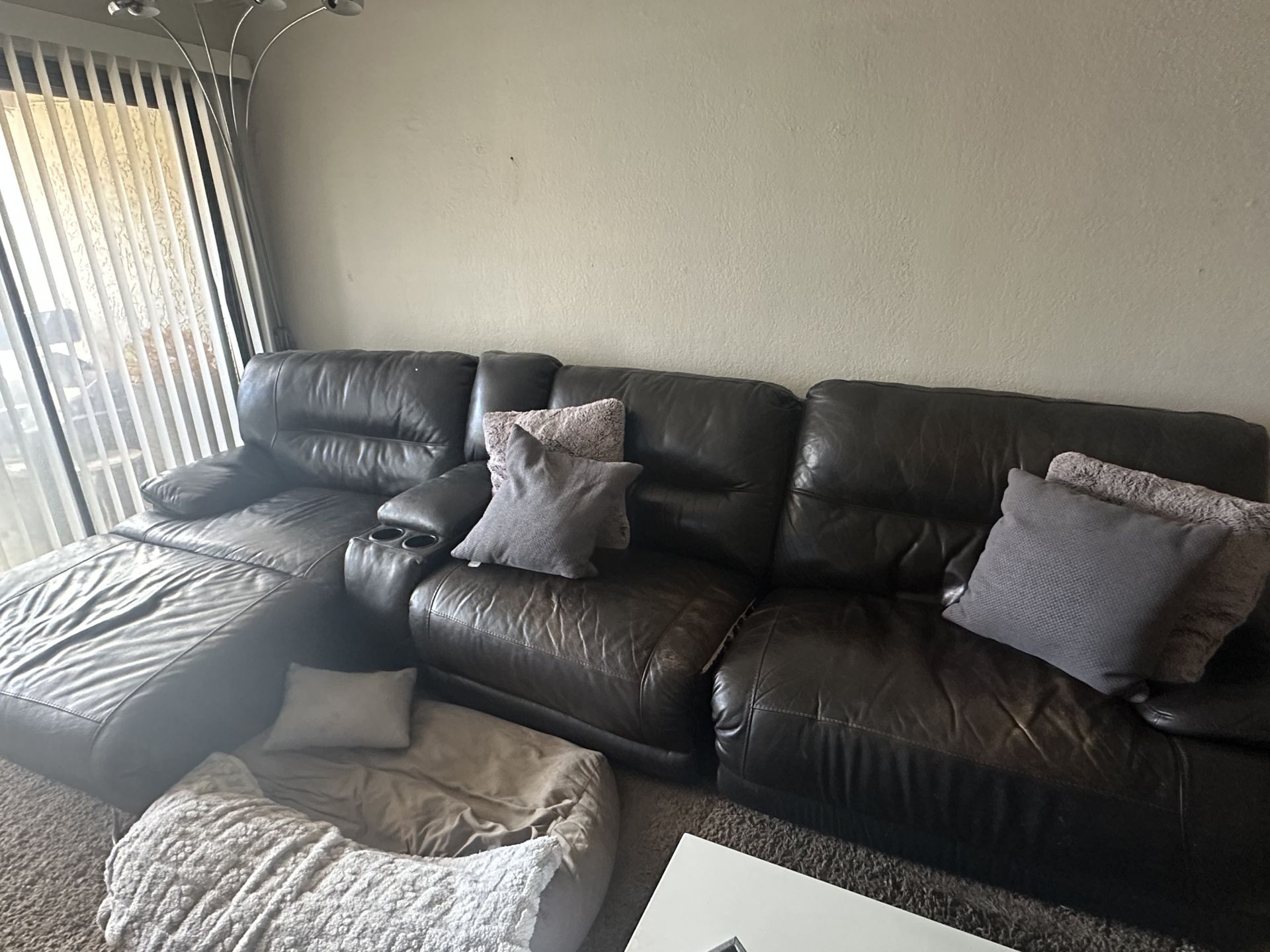 Leather Brown Couch- $80 (it comes apart into 3 pieces for packing purposes)/ it also reclines and is approximately 13 feet long. ***We cant deliver anything- you would need to come pickup, bring a friend to help (I am currently pregnant and cant carry stuff), and I am keeping this post up until we move out! I am pricing things pretty low. All items are from a smoke free home:)