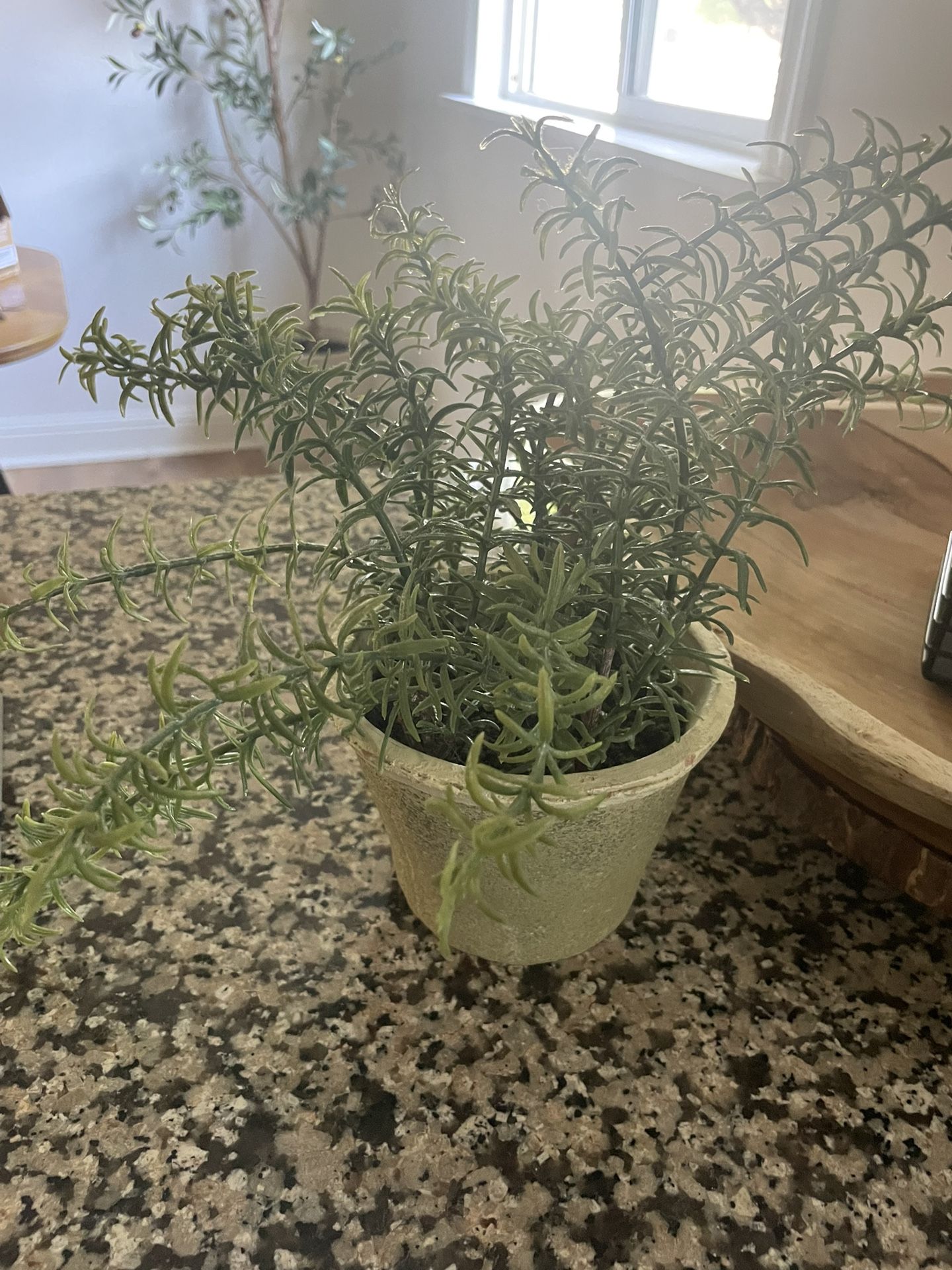 Healthy Faux rosemary plant in a decorative pot.