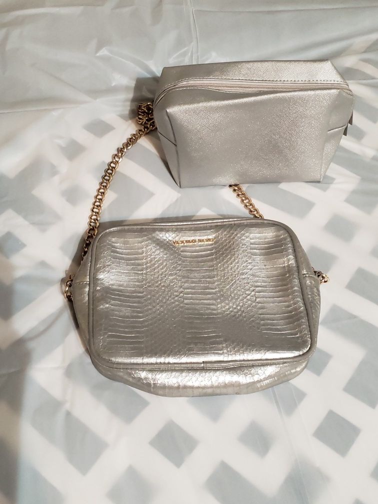 purse is victoria secret but makeup bag is unknown brand also silver. price is for both . the purse was used once but the makeup bag is new. pickup is in lodi off kettlemen and stockton st.