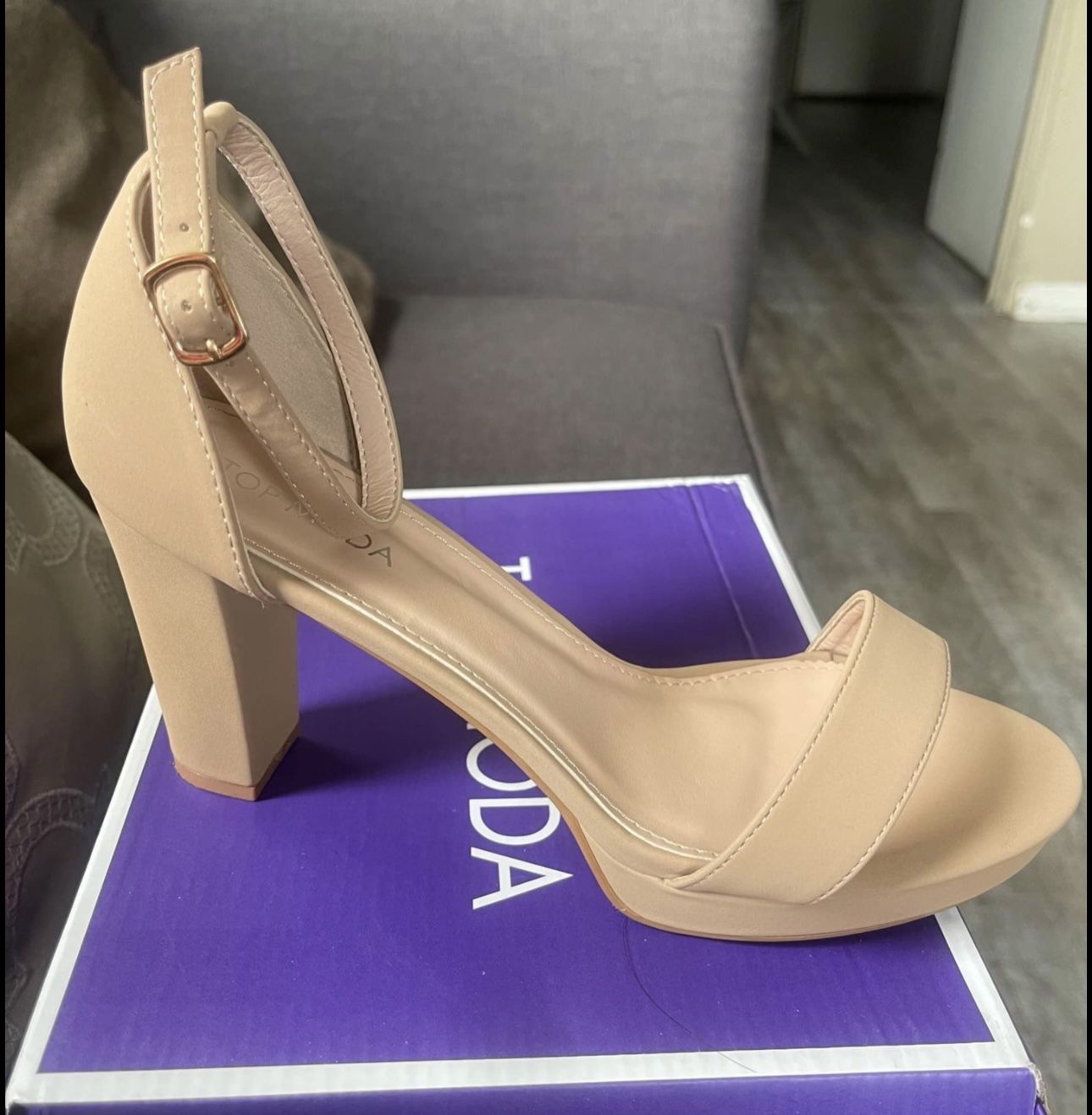 getting rid of these heels that were just worn once. the heels are a tan color. size 9. the heel is 3inches tall. nomas se usaron una ves. son talla 9. lo alto del tacon son 3pulgadas.