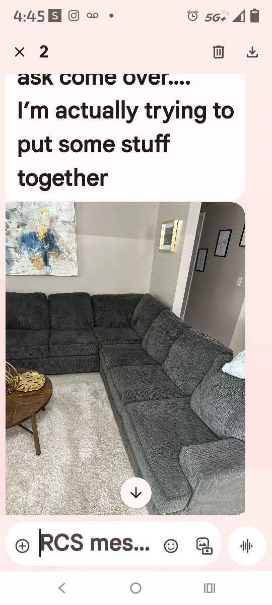 Grey L shaped family sectional. Clean, smoke free, elegant look. Great for family lounging.