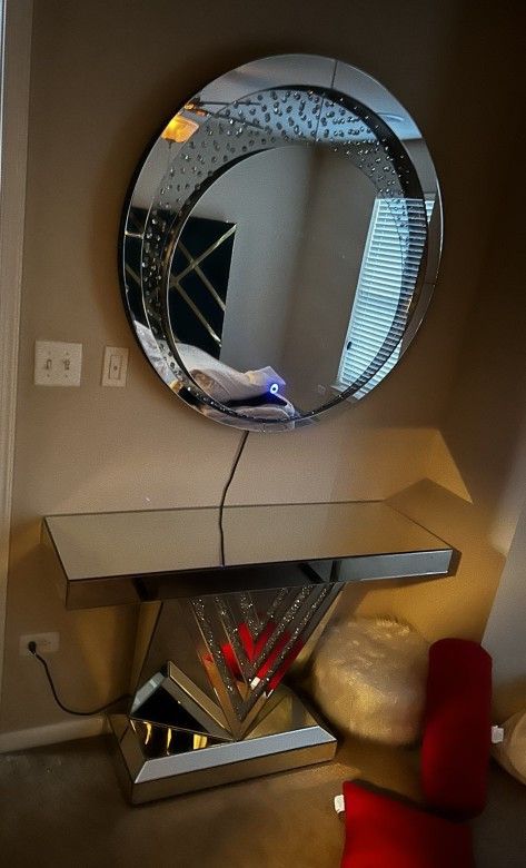 In brand new condition! Entryway console table with round led mirror. Paid over $2,000. Asking $750 or best offer! Need gone asap!