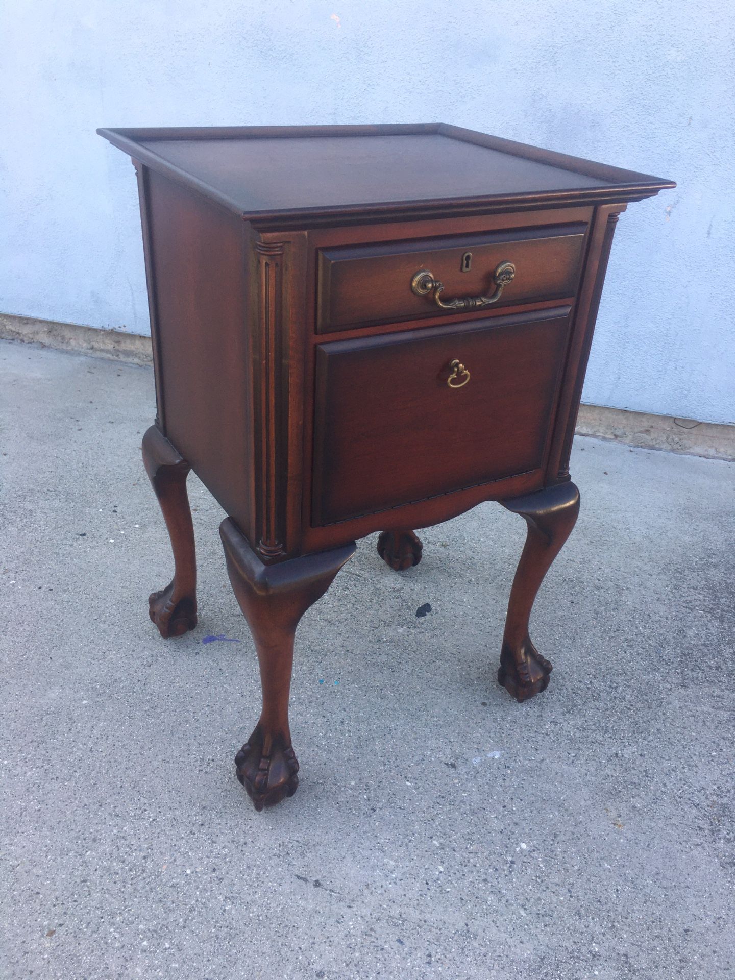 Pick up in West Covina Cash Only 20” x 18” x 30”H Bombay company Vintage Accent Table/Nightstand/End Table Elegant mahogany-finished bedside chest. Has single drawer. Drop-front storage too. Cabriole legs with cool ball-and-claw feet.