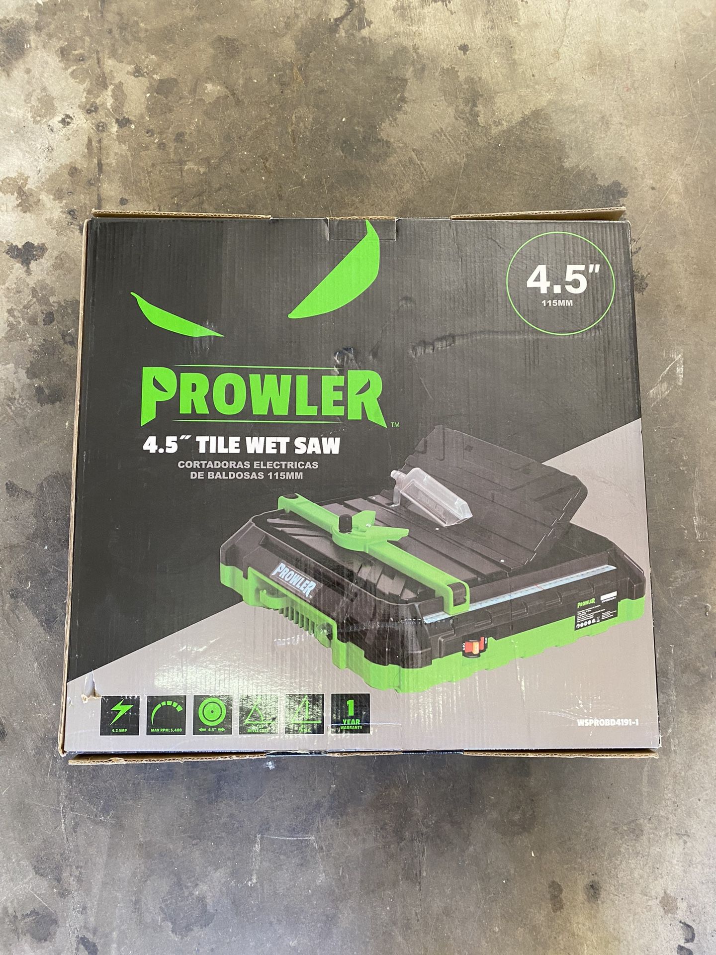 New unopened tile wet saw -plastic -table size 13” x 14” -motor amp: 4.2A -no-load speed: 5400RPM -voltage: 120V-60HZ -blade size: 4.5” -weight: 9LB -Cutting depth: 1” (0 degrees) -Bevel cuts: 0 degrees and 45 degrees -includes: 1PC Blade, 1PC Blade Guard, 2PCS Wrench, 1PC Ruler, 1PC Fence