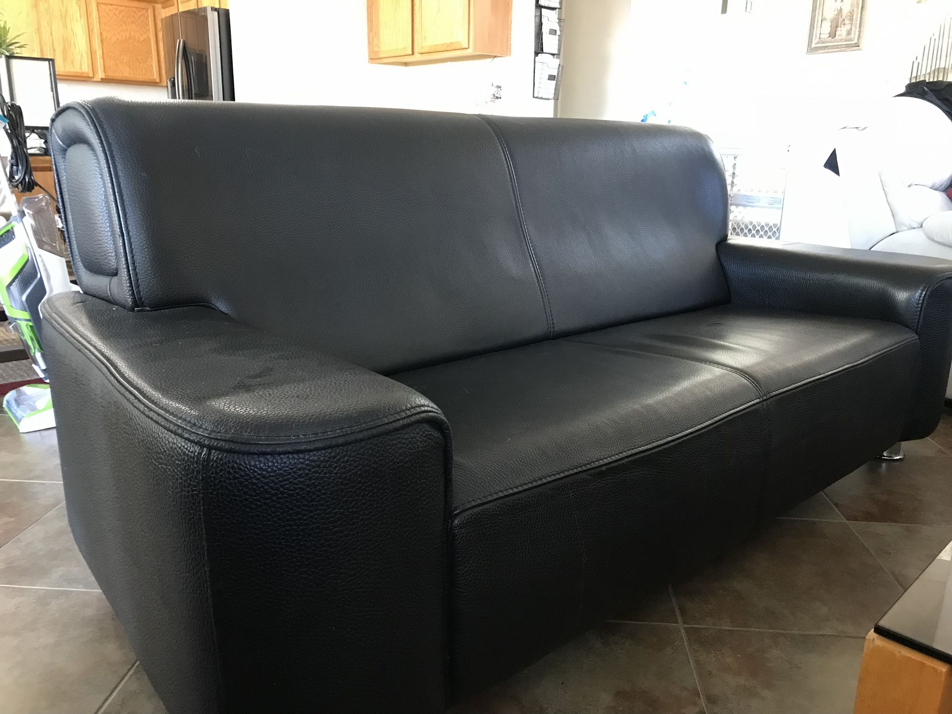Beautiful very well made black couch. Sold to me as leather when I bought it but, not 100% positive. New matching wood legs included. Great addition to any home. Also have a matching loveseat would sell if you need a set.