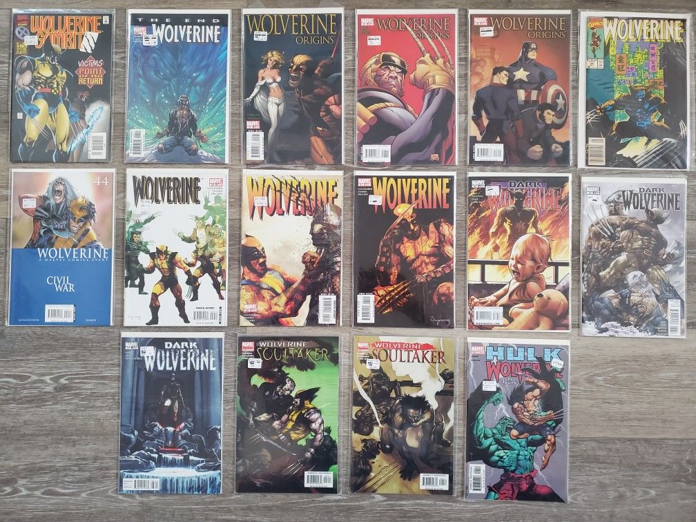 16 wolverine Comic Books all in very Fine +N/M condition . Bagged and Boarded # 4,4,5,8,16,24,44,59,60,61,80,86,87 , 3of5,4of4 and 4of5 ... $150 Or best offer ... You pick up or shipping and handling for $15 depends on location to be delivered ...