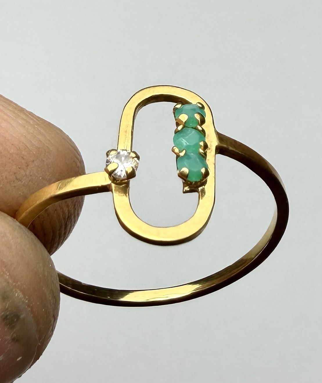 Solid 18K gold ring, size 6, weight 1.32g. Modern link/paperclip style with 3 green stones and 1 clear accent stone. Good condition—see photos. Pickup only.