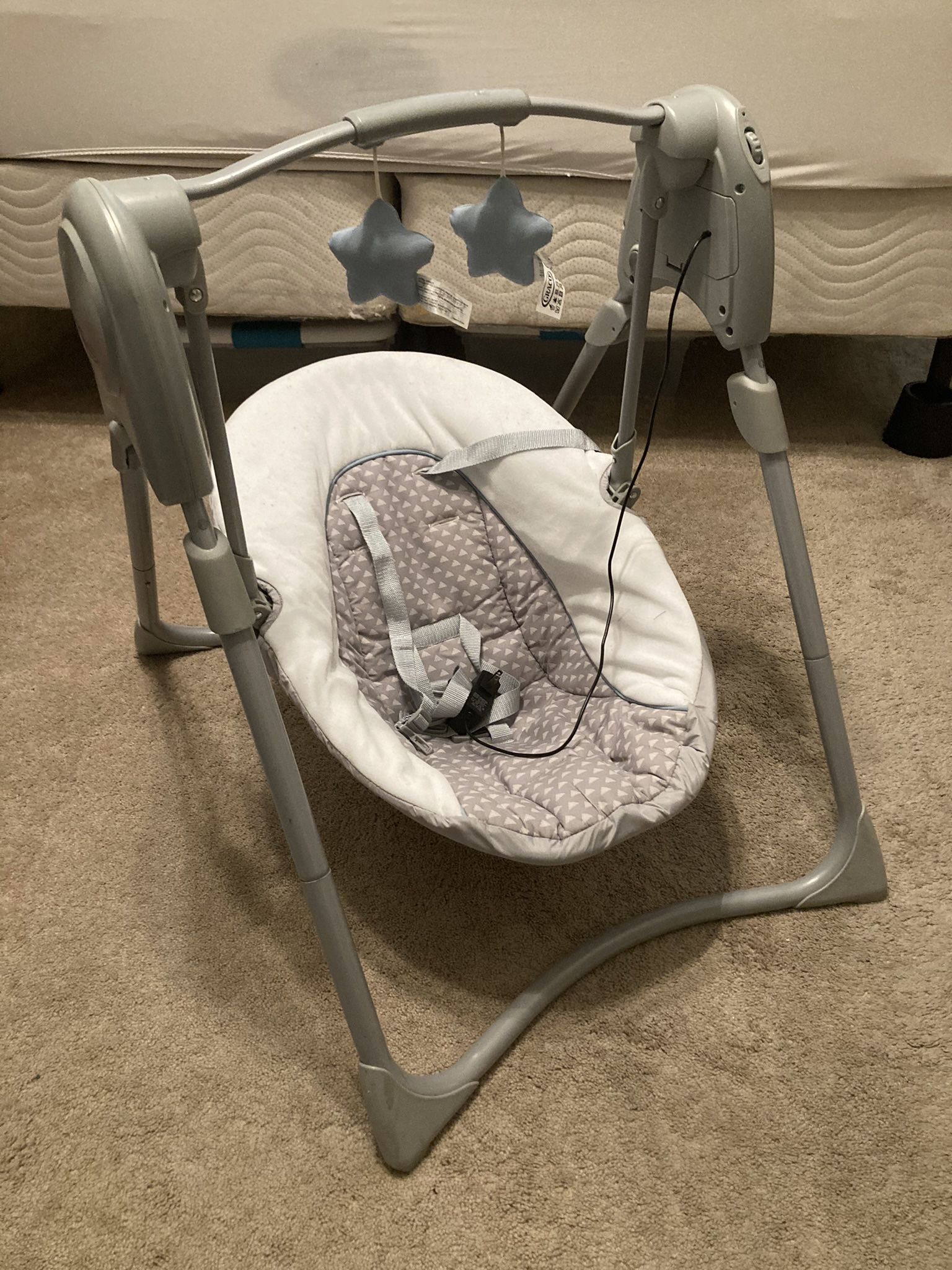This saved my soul quite a few times. There are different levels of swinging intensity, it kinda folds, and instead of batteries, we have wired it so it’s corded, but you could remove it and put batteries if you desire.