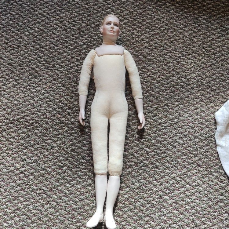 Muriel Kramer male doll - fine details. 19” tall - brand new - Excellent condition. Bisque shoulderheads, lower arms and legs. Cloth torsos. Signed on back of head (see photos). Collectible and rare find. Porch pickup. (GH).