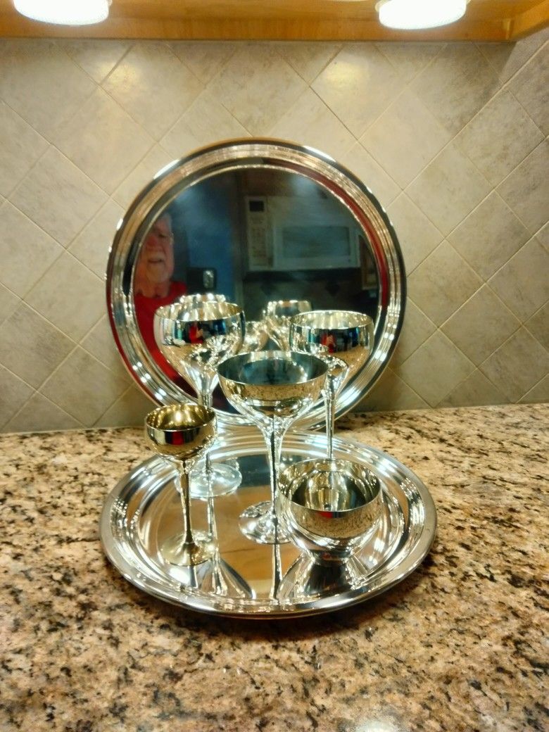 Like new, never used Silverplate over Brass 5 different size goblets/cups, 8 pieces of each size (1) 12" and (1) 15" serving tray 42 pieces total PICK UP ONLY. Westampton, NJ 08060