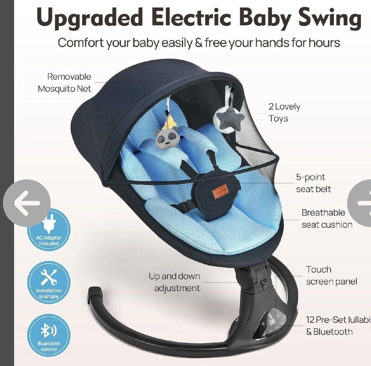 New No original box included Just like picture Retails for $90 Selling for $50 Soothing Multi-Speed Swing & Bluetooth Music】Our electric baby swing comforts fussy babies with 5 gentle sway speeds, and Bluetooth connectivity for playing lullabies or white noise. Perfect for newborns up to 9 months (max 20 lbs). 【No Obstruction Of Vision】Our swings are equipped with see-through mosquito nets. Unlike other products, the top of our mosquito nets is made of mesh gauze, so you can keep an eye on your baby at all times even when the mosquito net is in place, providing peace of mind and practicality.