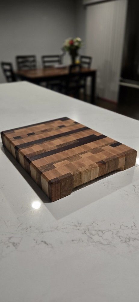 These boards are made here in Everett from salvaged, high-quality hardwood scraps in our shop, ensuring minimal waste and unique construction. Dimensions: 15.75 inches wide x 11.88 inches deep x 2.13 thick This handmade end-grain hardwood board is built for both heavy-duty kitchen work and elegant table service. Key Benefits: -Knife Friendly: End-grain construction keeps your knife edges sharper for longer. -Durable: Superior hardwood is dense, stable, and lasts a lifetime. -Versatile: Perfect for chopping, dicing