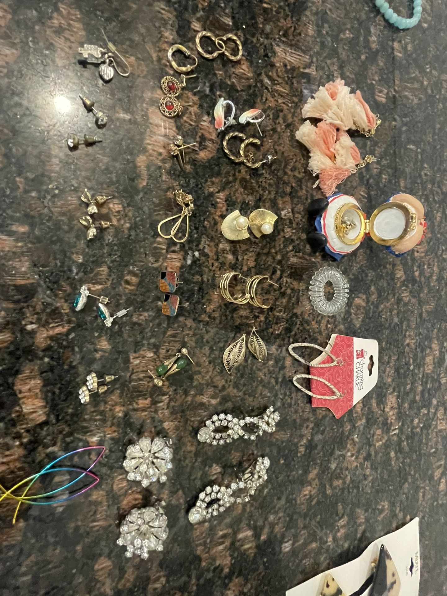 There are 21 earrings and 16 rings: $1 - for gem metal ring $0.50 for kid rings $0.50 - small earrings $1 - larger earrings Asking $20 for the lot or best offer.