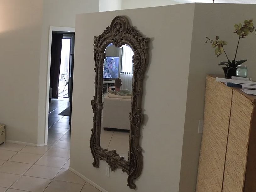 Large Gold Ornate Mirror as pictured. Measurements in pictures approx 75” tall x 39”. Pick Up in Deerfield Beach.