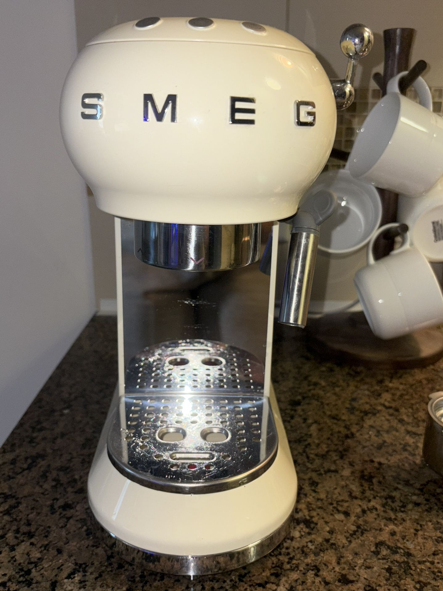 SMEG Espresso Machine + Stainless Espresso Cups & Frother. All in excellent condition, lightly used. Cups and frother purchased separately from Crate & Barrel. Selling as a set. $400 OBO.