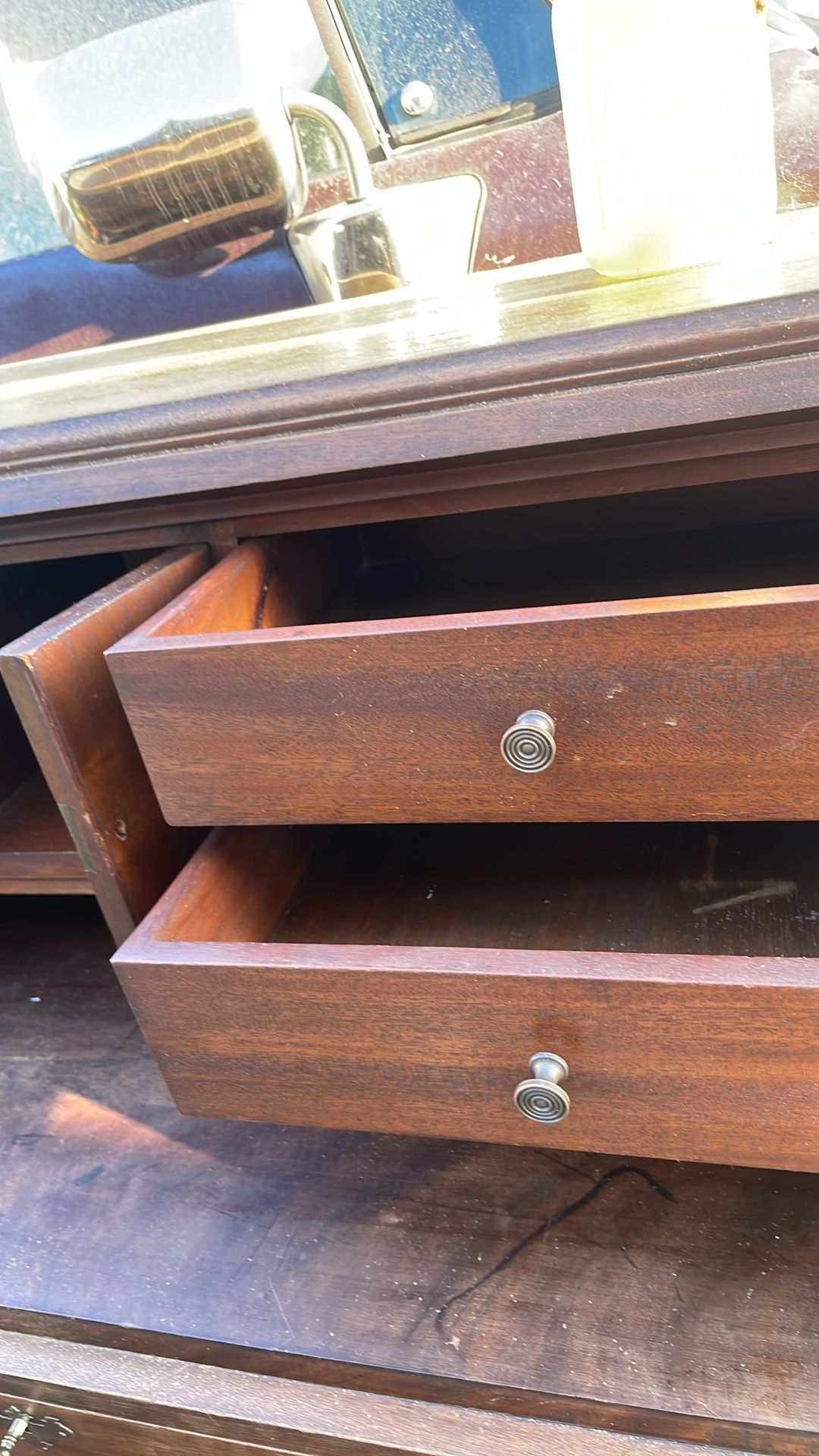 Needs some TLC but really a nice old all wood desk. With locking key for top drawer. 46H. 22 3/4 W. 42. 1/2L Very heavy need 2 people or more.