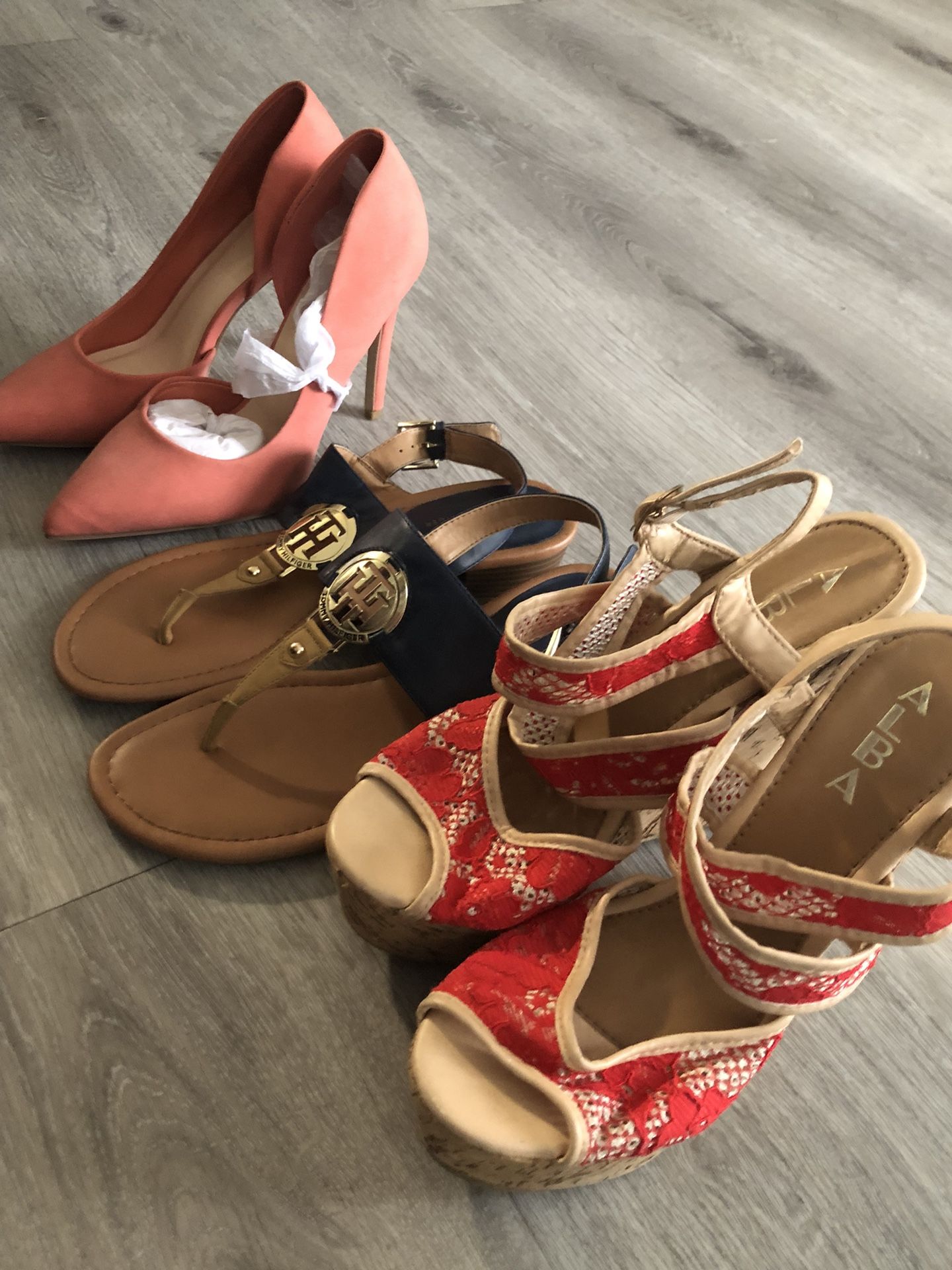 for the Tommy Hilfiger I’ll take 50 and size 8 1/2 and the pink heels I’ll take 25 size 6 1/2 and the red heels I’ll take 35 size 6