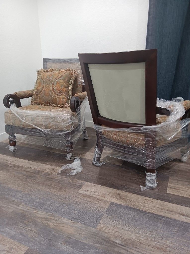 Great condition 2 vintage chairs Pick up at my storage unit in Rancho Cucamonga Delivery available 2 chairs End of one arm was broken and fixed at some point. See last pic About 38 inches tall Seat is about 25" inches wide in the middle on cushion to sit and about 30" inches wide with arms Chairs are about 30" from front to the back