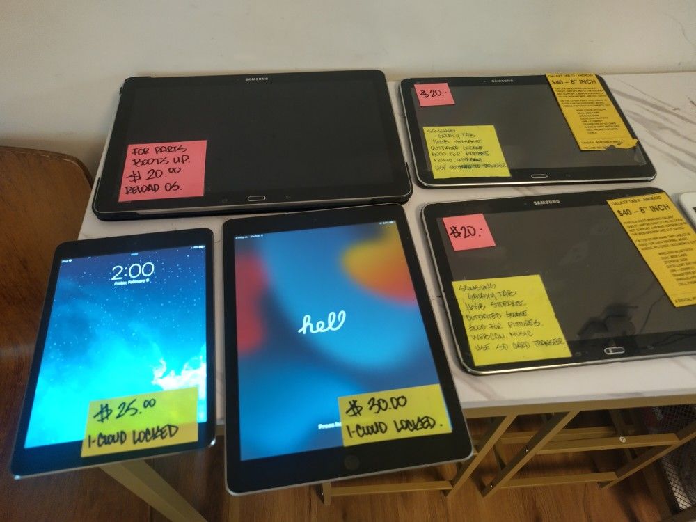 Sold as-is $120 for all 3 newer Apple iPad Air s They all have the apple I cloud lock ,3 Samsung Galaxy tabs - 2 - 10" - 1 - 12' Good but older. Android All sold together $120 for all Pick it up Venice and motor avenue