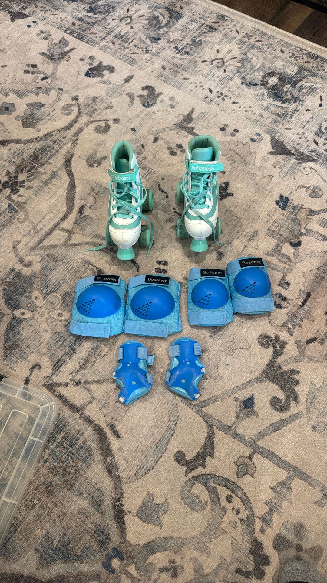 Size two kids roller skates Comes with knee pads Elbow pads Palm protectors