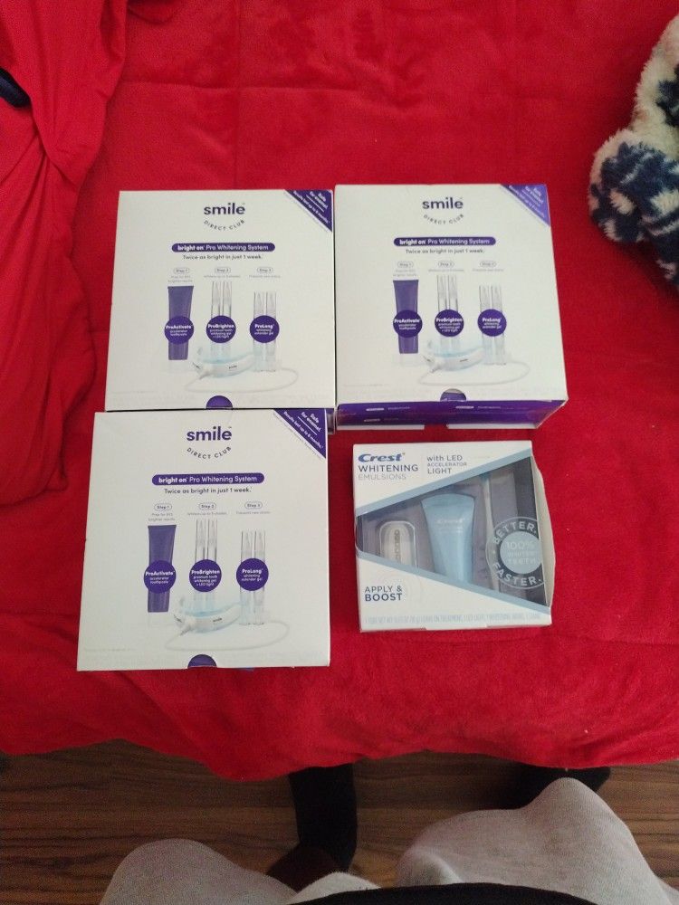 Have a few teeth whitening systems. Smile direct club and Crest. Brand new unopened boxes. Make great gifts or brighten your smile for the holidays. Have no use for them. Make me an offer asking for $20 a piece