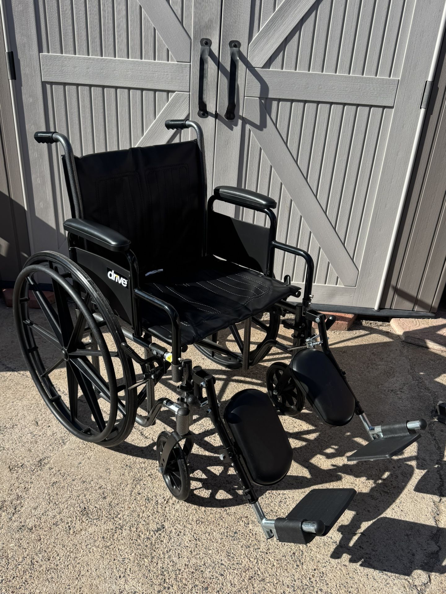 20" wheel chair with elevating leg rests. Holds up to 350lbs and folds up easily for transportation. Thank you
