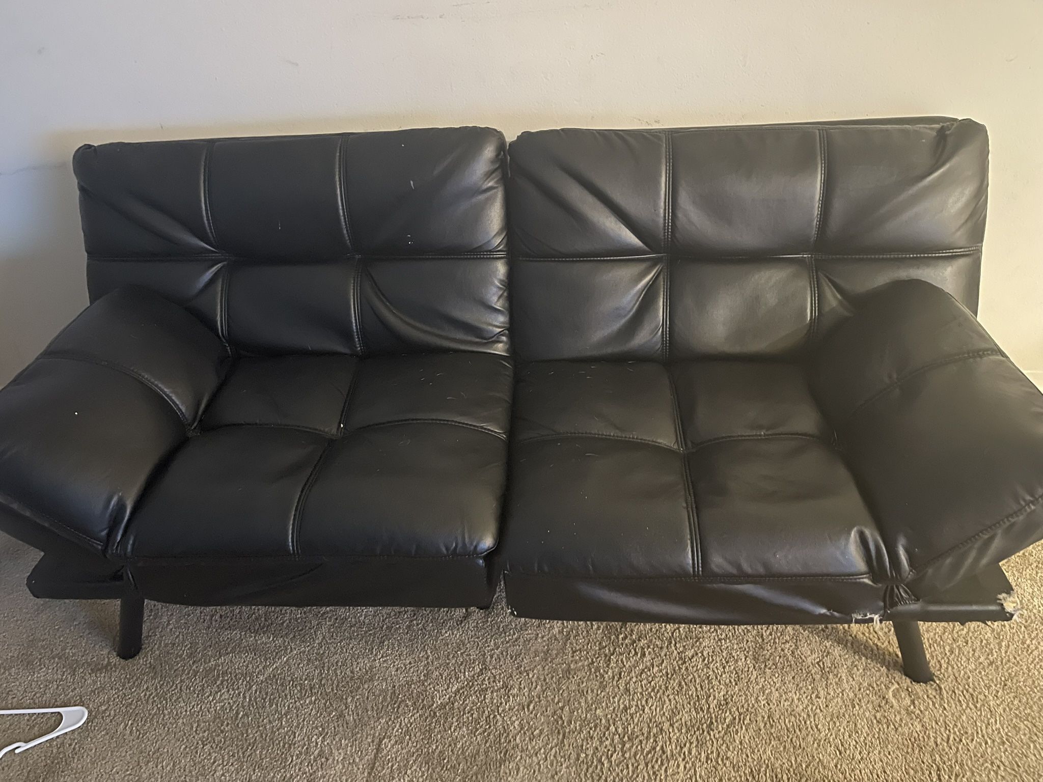 Futon for a teenage hangout or just beginning furniture for somebody who needs quick cheap furniture. There is damage to it due to me my sister‘s dog, chewing the corners of it, it does have adjustable backs and arm rests that work without issues.. I cannot meet anywhere. I do not have a vehicle so it would be pick up from my home.. cash only!!