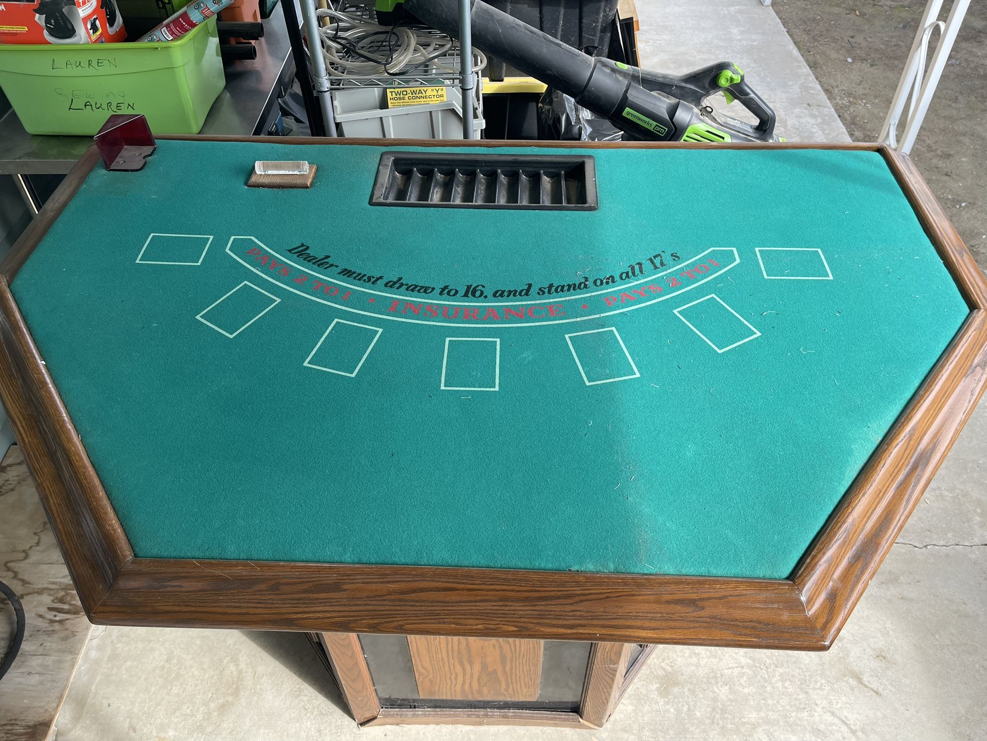 Custom-built solid wood blackjack table. • Approx. 6 ft long × 3.5 ft wide × 4 ft tall • Casino-style dealer height • Built-in chip tray and card slot • Storage drawers and shelves on the dealer side • Heavy, furniture-style construction (not a folding table) • Felt is in good condition The engraved wood cover is removable, so it can be used as a standard blackjack table. A couple small boards need to be reattached, but overall it’s a solid, functional table. Great for home games, man cave, bar, or game room. Local pickup only due to size and weight.
