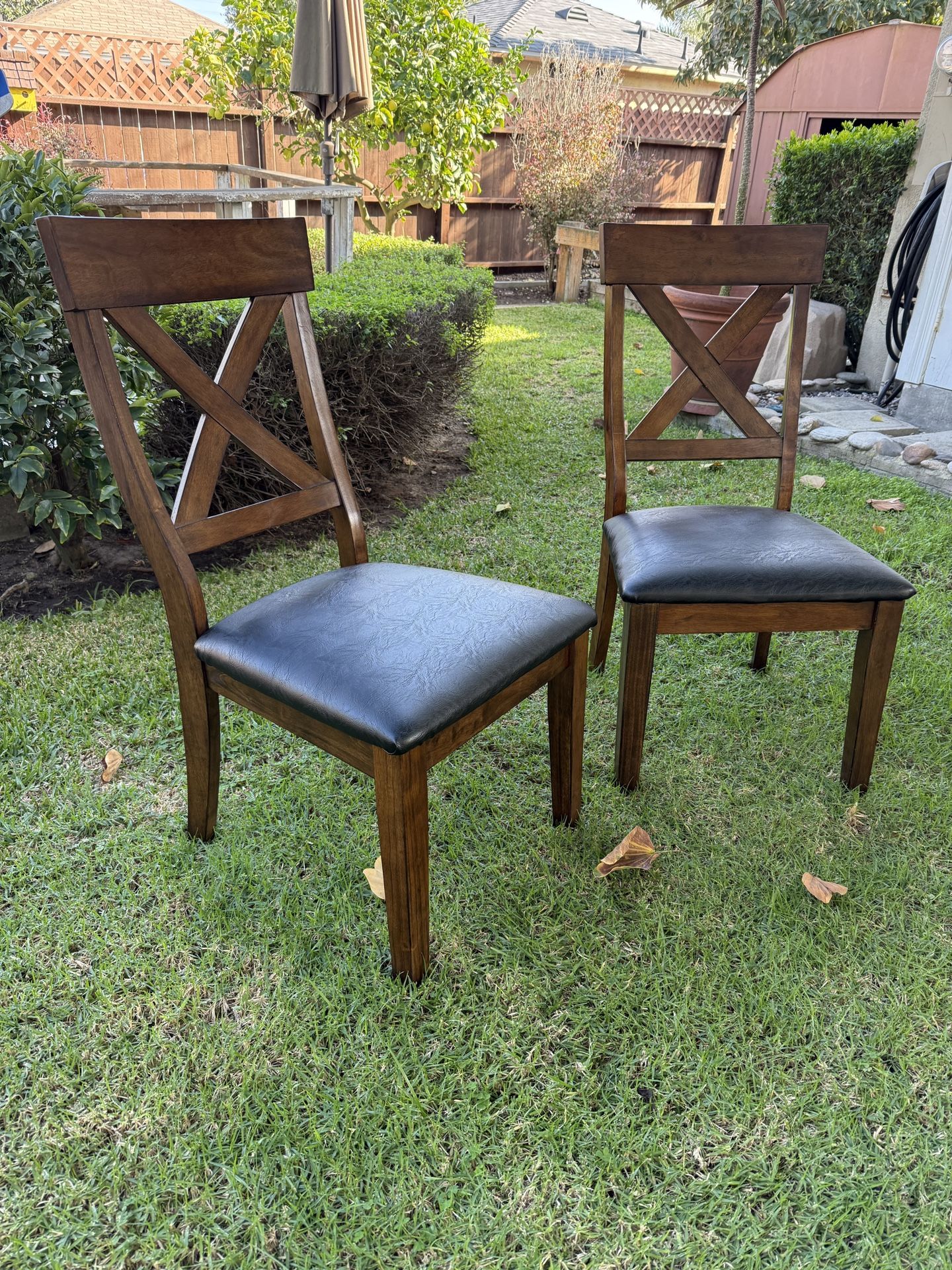 Pair of gorgeous transitional/farmhouse-style side chairs featuring the classic double X-back design. Rich dark brown wood finish with comfortable padded black faux leather (vinyl) seats that wipe clean easily. These have a timeless rustic-modern vibe – perfect for your dining room, kitchen table, or even as extras/accent seating. Built sturdy with solid wood frames, no wobbles or issues. Dimensions: 19x20 cushion 19 inches length Height- 18 inches (floor to cushion) -39 inches (floor to top of backrest) $160 obo Pickup only Located in Westchester (near LAX) Cash or Venmo accepted