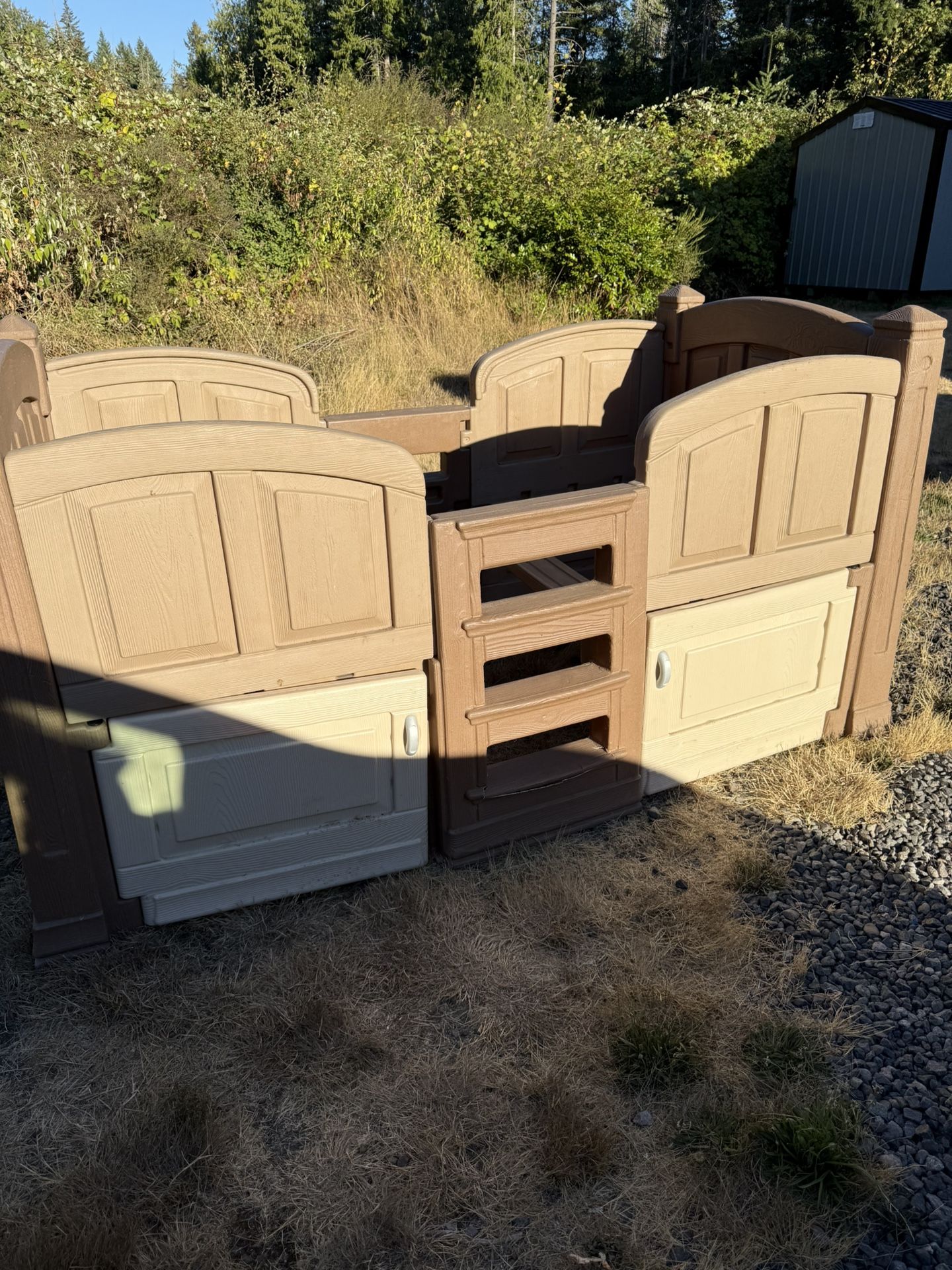 Twin bed frame. Not bolted together so it can be taken apart and transported (bolts are included). No mattreess. One side has a crack in the step but doesn’t affect usage, we usually just keep that side against the wall . There are doors to access the underneath the bed. My kids loved to hide under it. Pick up in Eagle Creek 97022