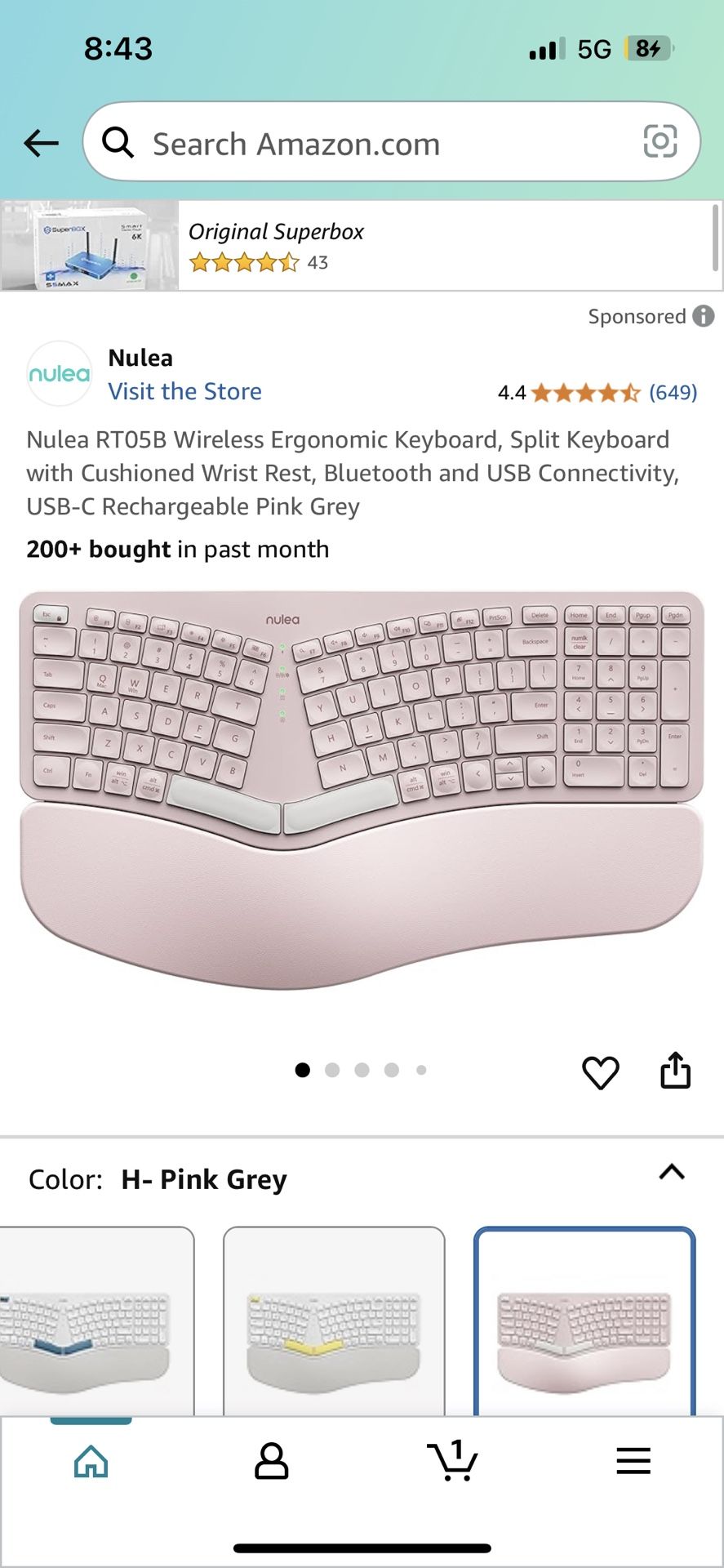 Nulea RT05B Wireless Ergonomic Keyboard, Split Keyboard With Cushioned Wrist Rest, Bluetooth And USB Connectivity, USB-C Rechargeable Pink Grey Reg. $55