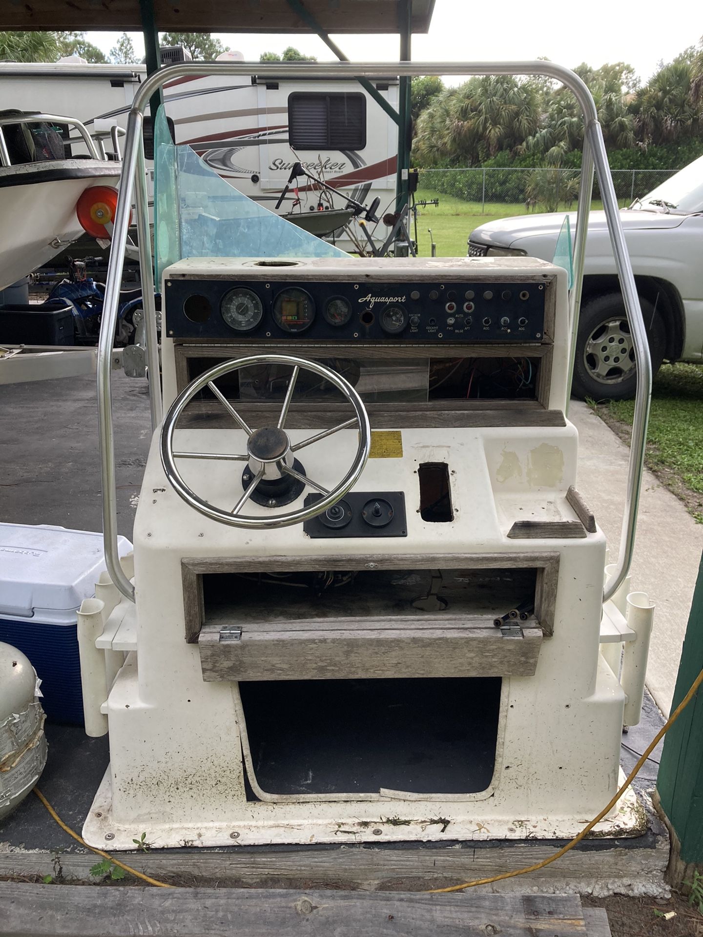 It’s a center consul off an aquasport boat in good shape just windshield is broken and two rod holders have cracks then other than that it can put on another boat easily