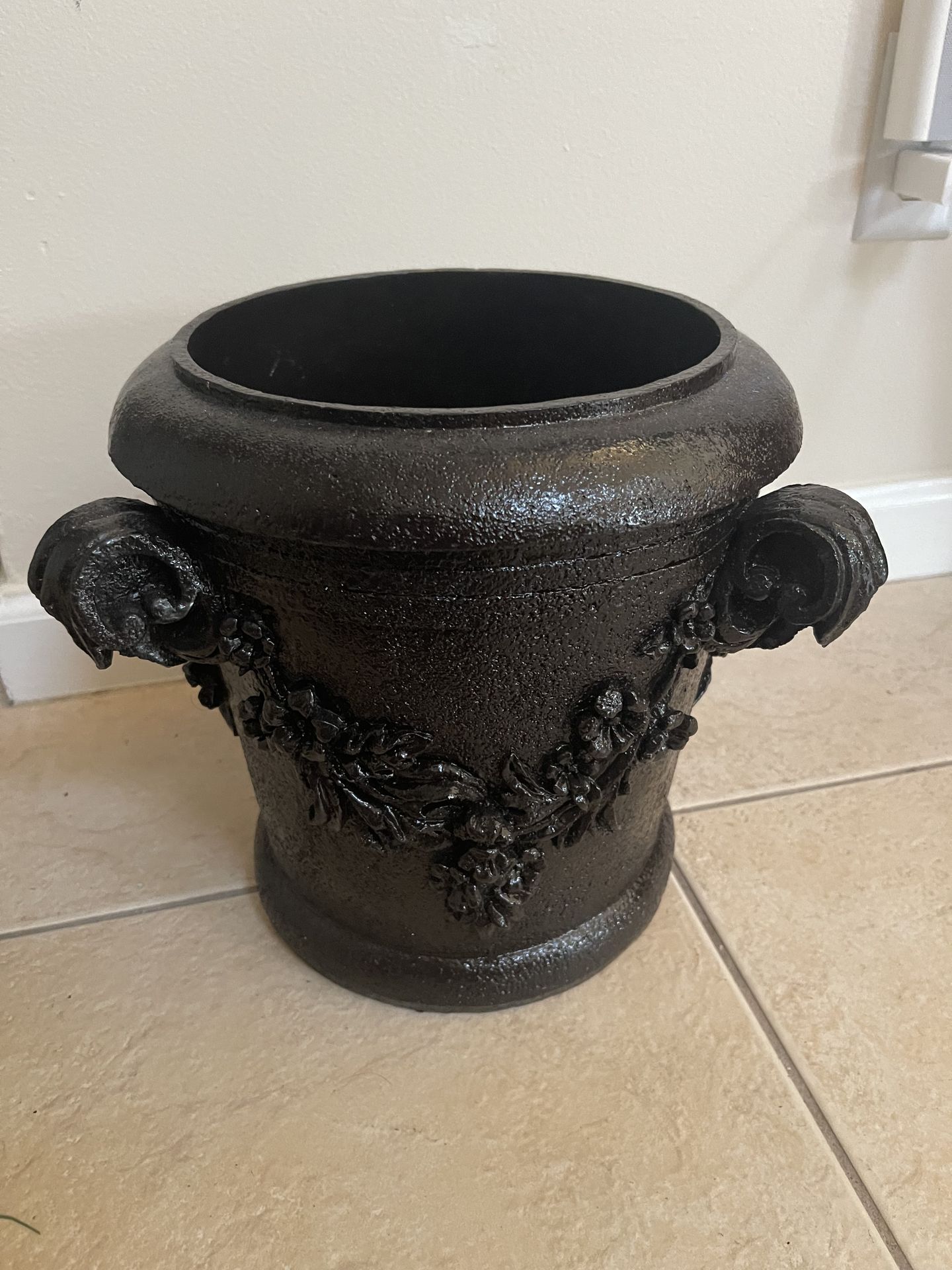 Measures 10” in diameter at top. Handle adds another 1 3/8”. Opening is 7.5” and is 8 1/4” at base. 10.5” H. Good condition. Please check my other listings for more planter pots. Local pickup near fairgrounds.