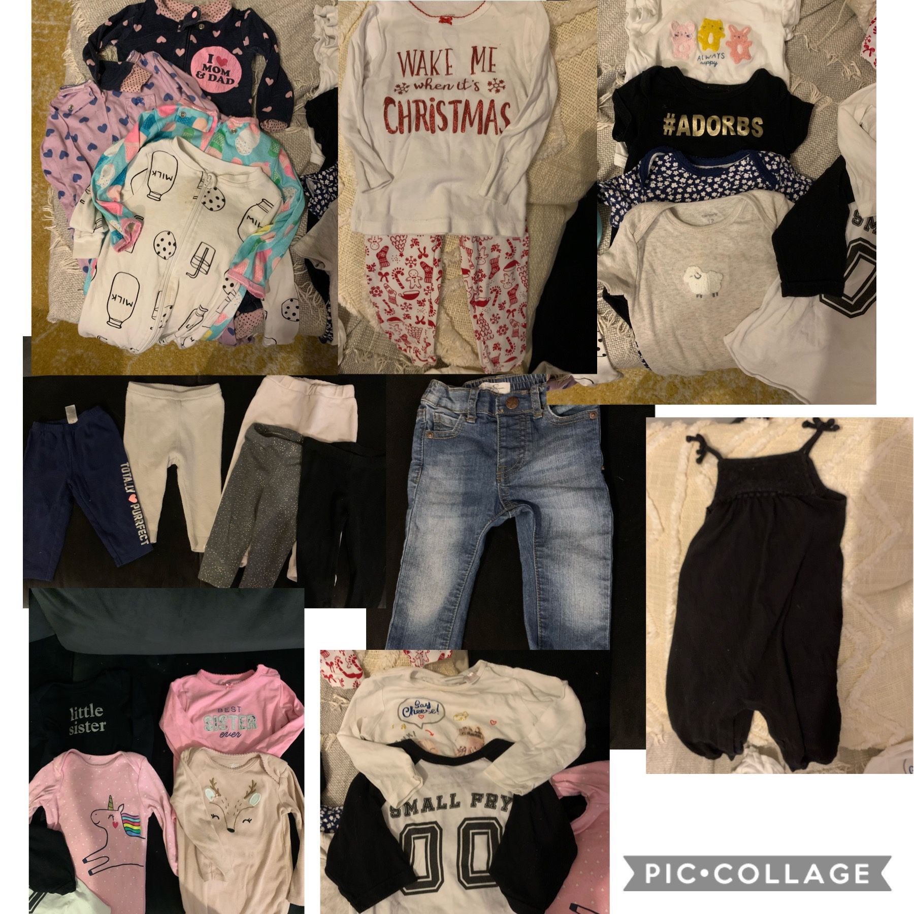Black romper 6-12 Months Blue flower onesie 9 Months Everything else is 12 Months 4 short sleeve onesies 4 long sleeve onesies 2 long sleeve shirts 1 pair of jeans 2 sweats 3 leggings 1 romper 5 pajamas ***A few items have stains on them*** Bundle Sale