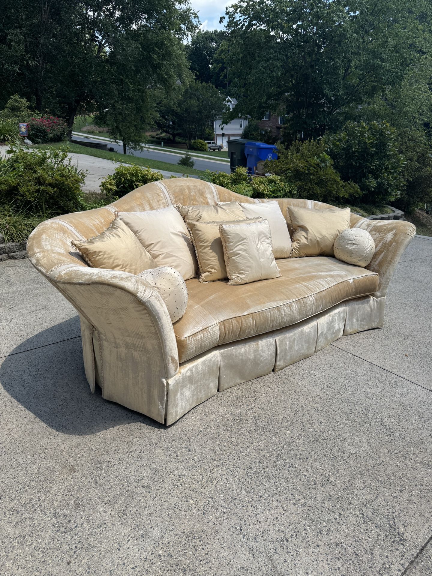 Looking for a trade on this Marge Carson Holy Style Sofa. Offer anything you’d like Originally $14,000! Spots to note have been pictured, overall excellent condition slight discoloration on bottom of skirt where weights hold it down. Entire skirt is held by velcro and can be replaced. One decorative piece on the backside is missing Dimensions 115”W x 56”D x 44H Height of the back is 46 in ~350 lbs