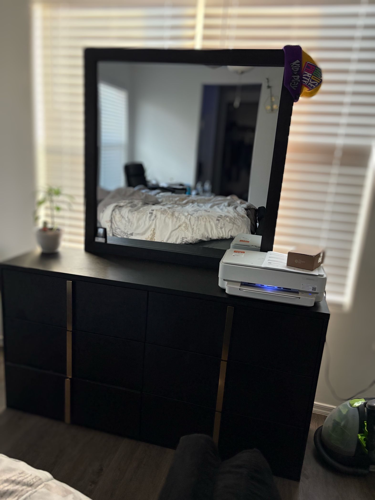 Black and Gold bedroom set for sale. Queen bed frame with light in headboard. Dresser with six drawers and a mirror…and night stand with two drawers. Furniture is like new. *** I don’t the dimensions of anything.** ***PICK UP ONLY** LOCATED IN CASA GRANDE.
