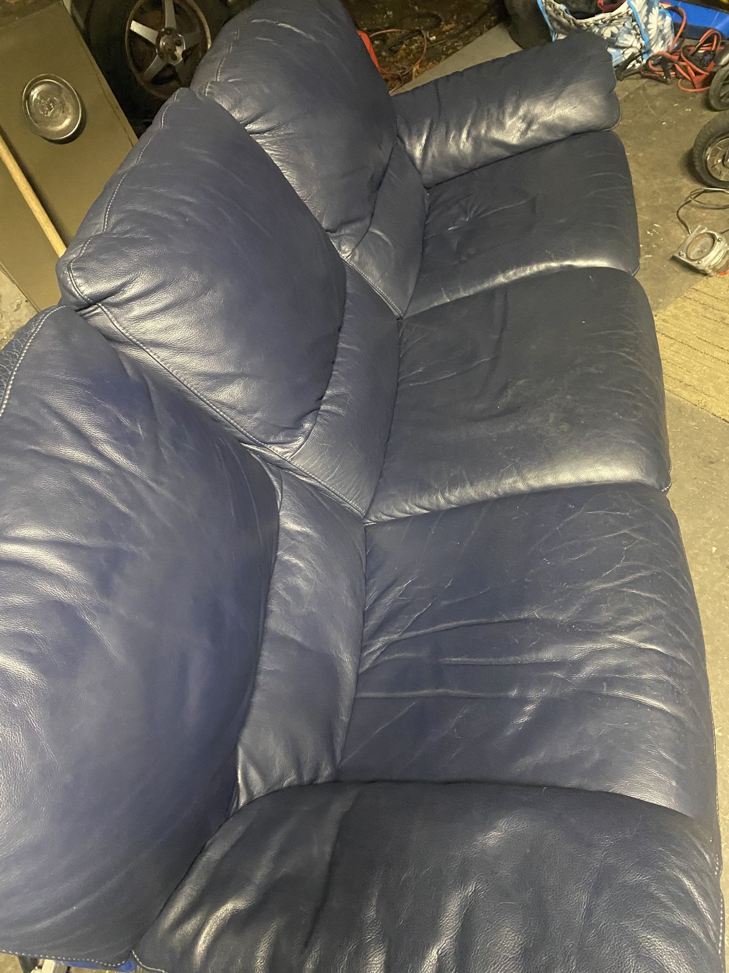 Recliner leather blue couch. It’s from a home with no smoking and is a comfortable couch. Everything works on it.