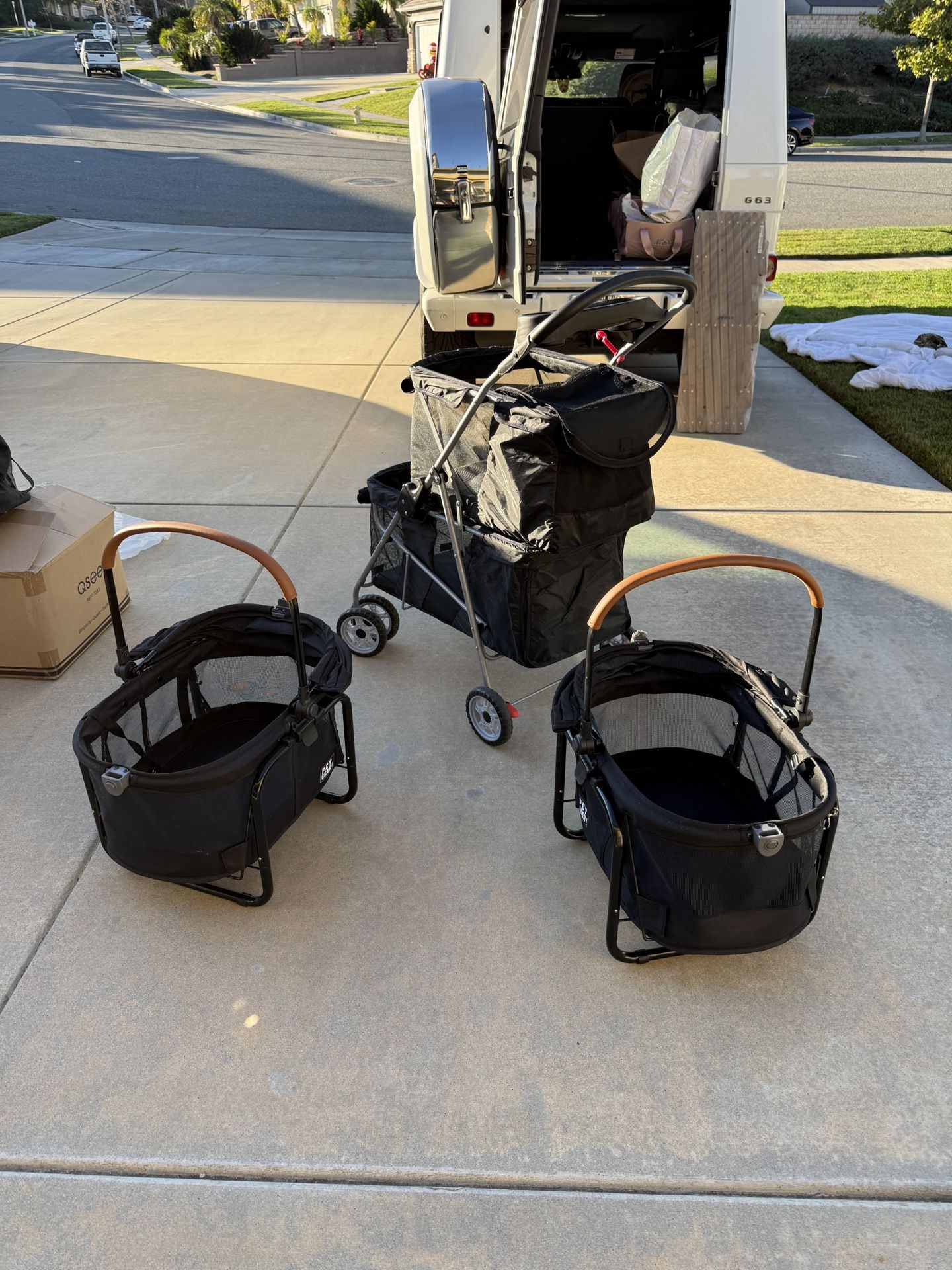 For sale, like new Double decker dog stroller and two car carriers Located in Tustin, pick up only