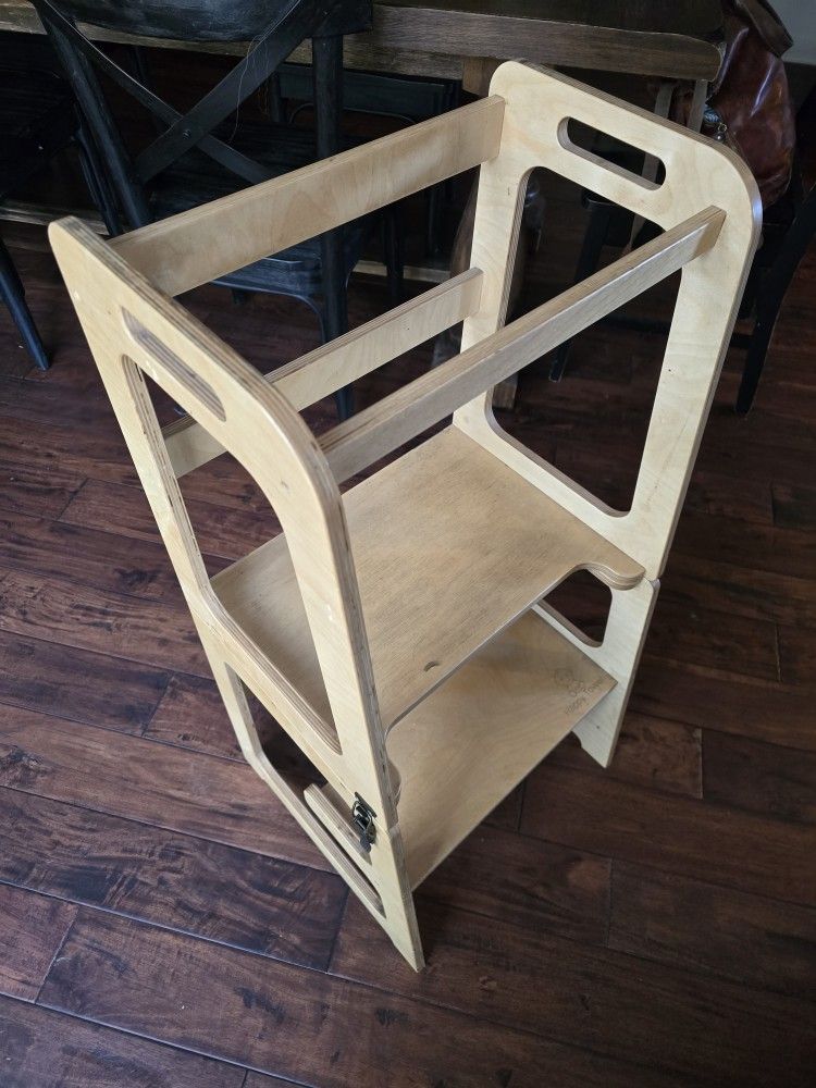 All natural solid wood. Good condition convertible toddler tower to desk. Desk size perfect for art, lunch or snack time.