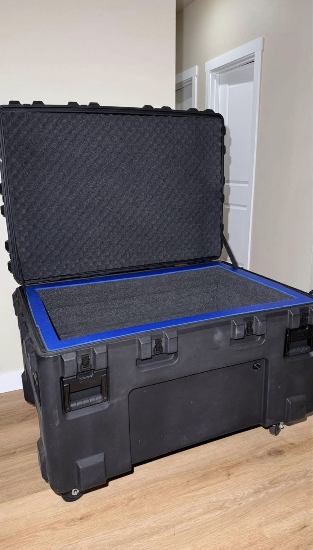 SKB large rolling hard case with custom foam interior. Heavy-duty SKB construction with wheels and side handles for easy transport. Includes breather/pressure valve, strong latches, and protective foam padding. Ideal for AV gear, instruments, drones, tools, firearms, and professional equipment. Brand: SKB. Good used condition with normal wear. Local pickup preferred due to size.