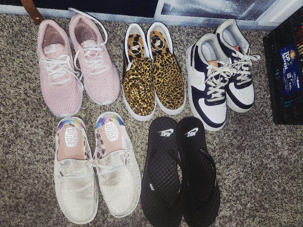 Pink nikes women's 6.5.......$12 Hey dudes women's 7 y6....$15 Cheetah nikes women's 8...$15 Suns edition nikes 6 y..........$20 Nike flip flops men's 10.......$3 OR ALL FOR 45 porch pick up by coyotes in Hillsboro oregon